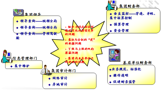● 管理(lǐ)模式與管理(lǐ)工具的不匹配。現(xiàn)在公司内采用的是一(yī)種集中式的财務(wù)管理(lǐ)模式,顯然現(xiàn)有分(fēn)散式财務(wù)信息系統應用模式不能(néng)滿足集中式财務(wù)管理(lǐ)的需求無法滿足集團對下(xià)屬單位的監管要求。集團公司沒有有效的手段加強監督和控制,不符合現(xiàn)代集團企業集中式管理(lǐ)的趨勢。